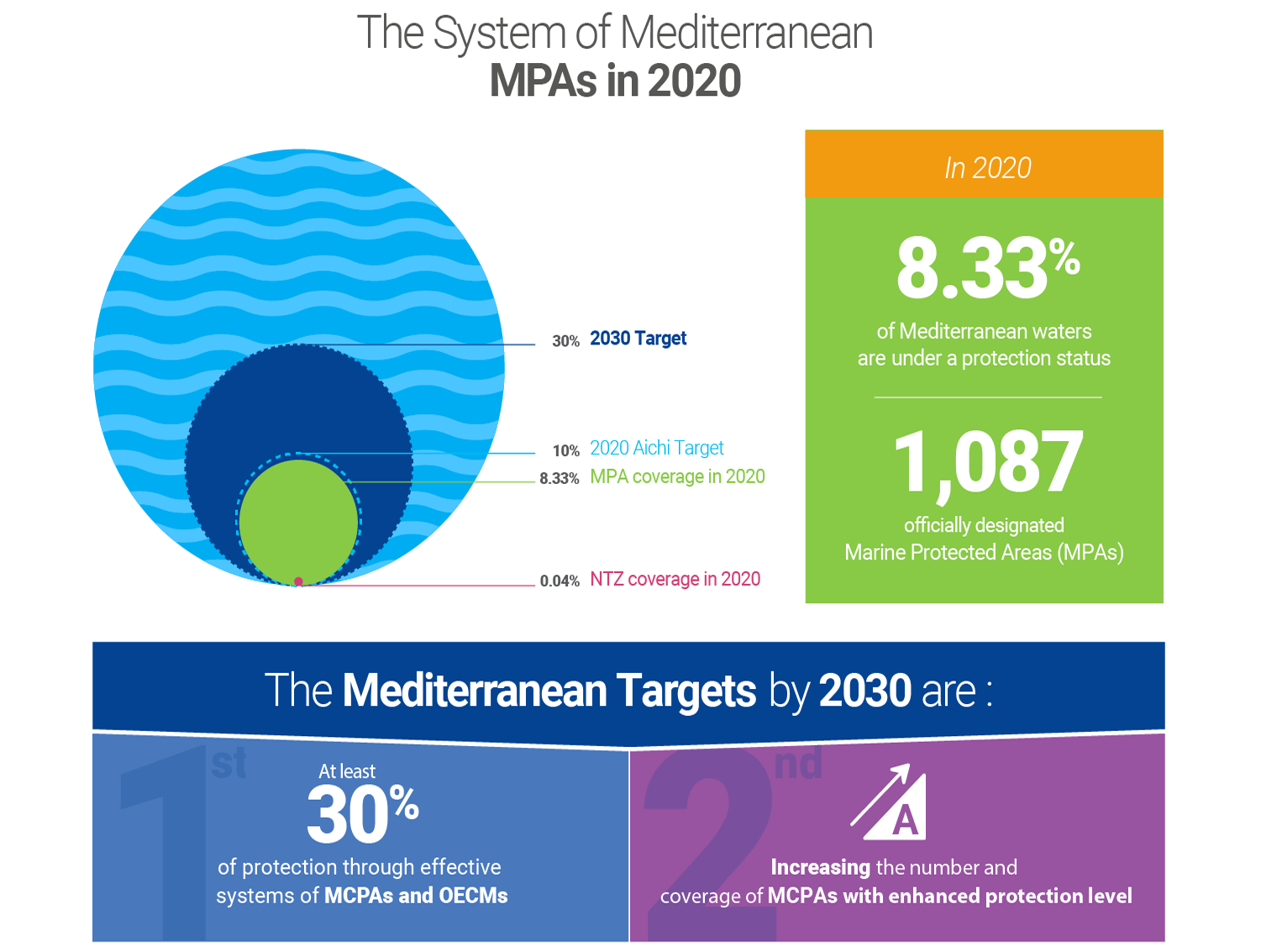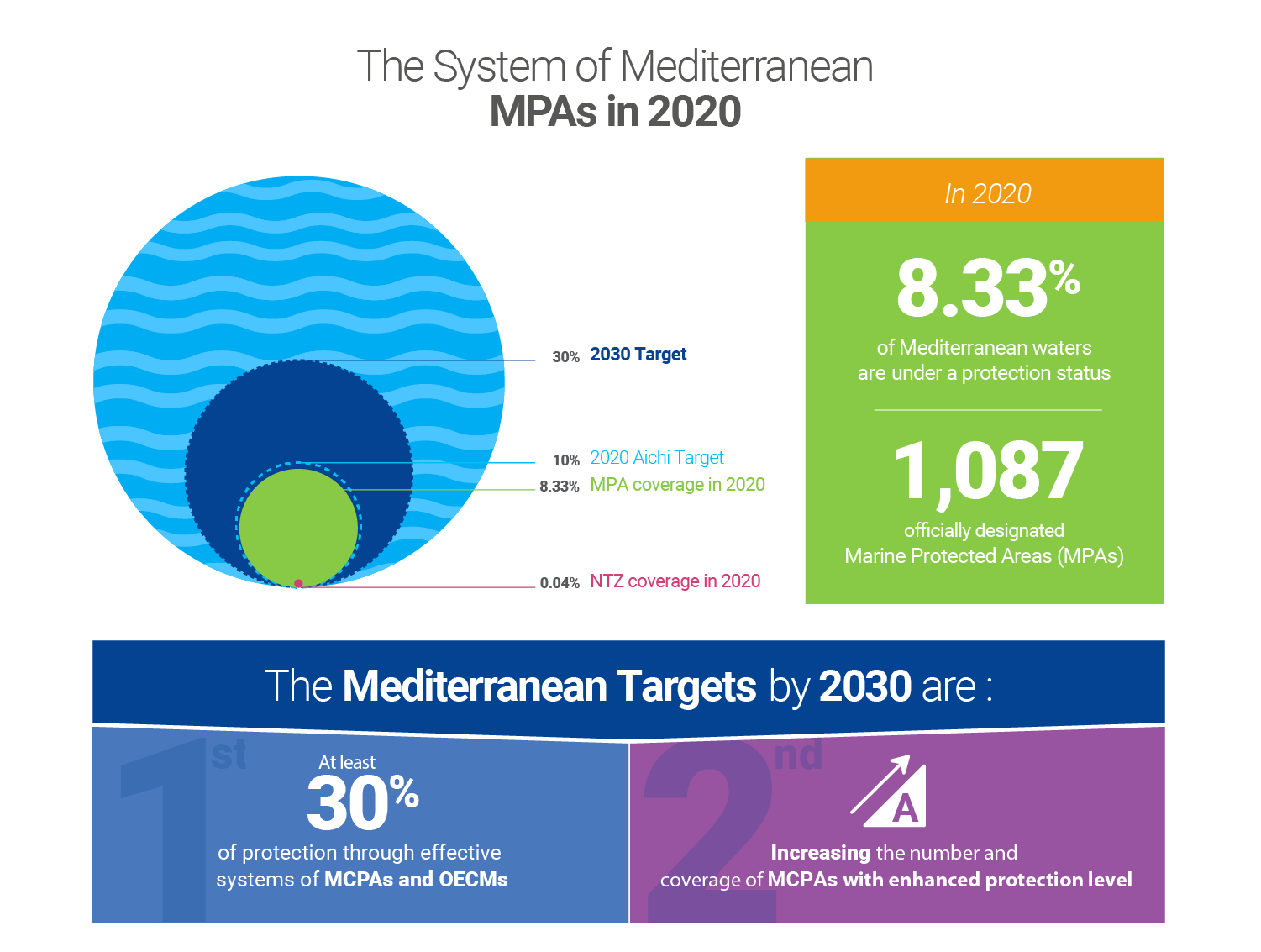 Based on this fact, the Contracting Parties requested SPA/RAC to elaborate an ambitious and transformational post-2020 strategy, in line with the Post-2020 Global Biodiversity Framework and other regional and global processes. The purpose was to further advance and strengthen the network of Marine and Coastal Protected Areas (MCPAs) and Other Effective area-based Conservation Measures (OECMs) in the Mediterranean, meet global targets, and address the geographical imbalance, the strong bias in relation to the type of ecosystems protected, and the weak management and enforcement.